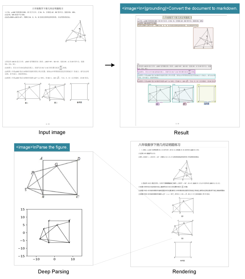 Figure 9:DeepSeek-OCR also possesses the capability to copy (structure) simple planar geometric figures. Due to the intricate interdependencies among line segments in geometric shapes, parsing geometry task is extremely challenging and has a long way to go.