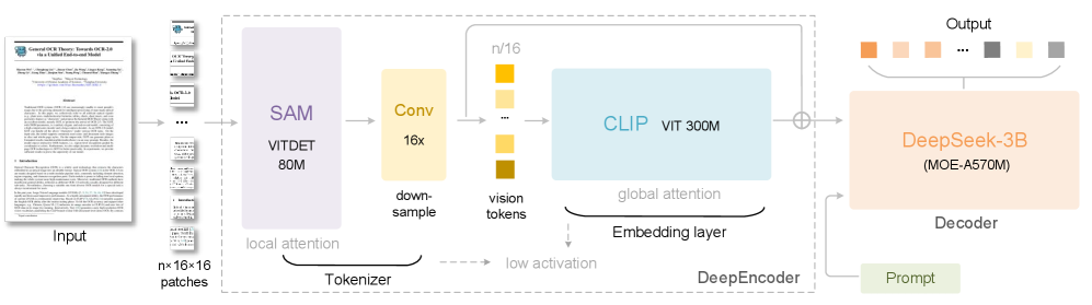 The DeepEncoder is where the compression happens. It handles high-resolution inputs more efficiently in terms of memory and token counts.