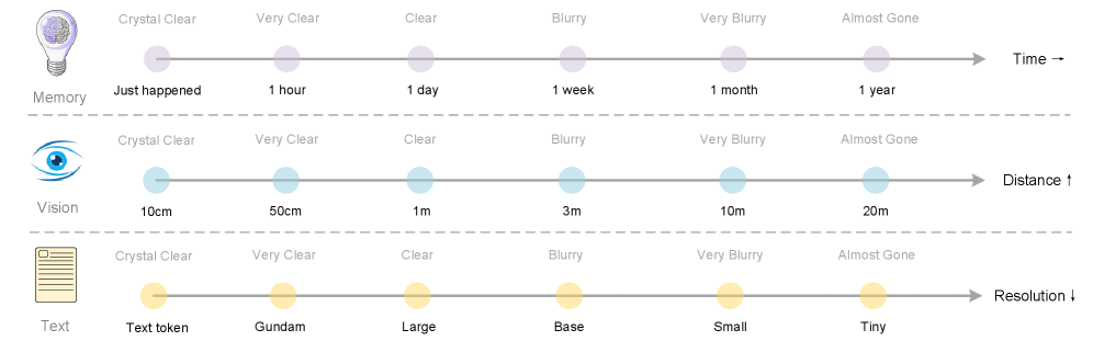 Natural forgetting: Instead of hand dropping old token, DeepSeek can ‘downsample’ old context visually like human memory blurry over time.